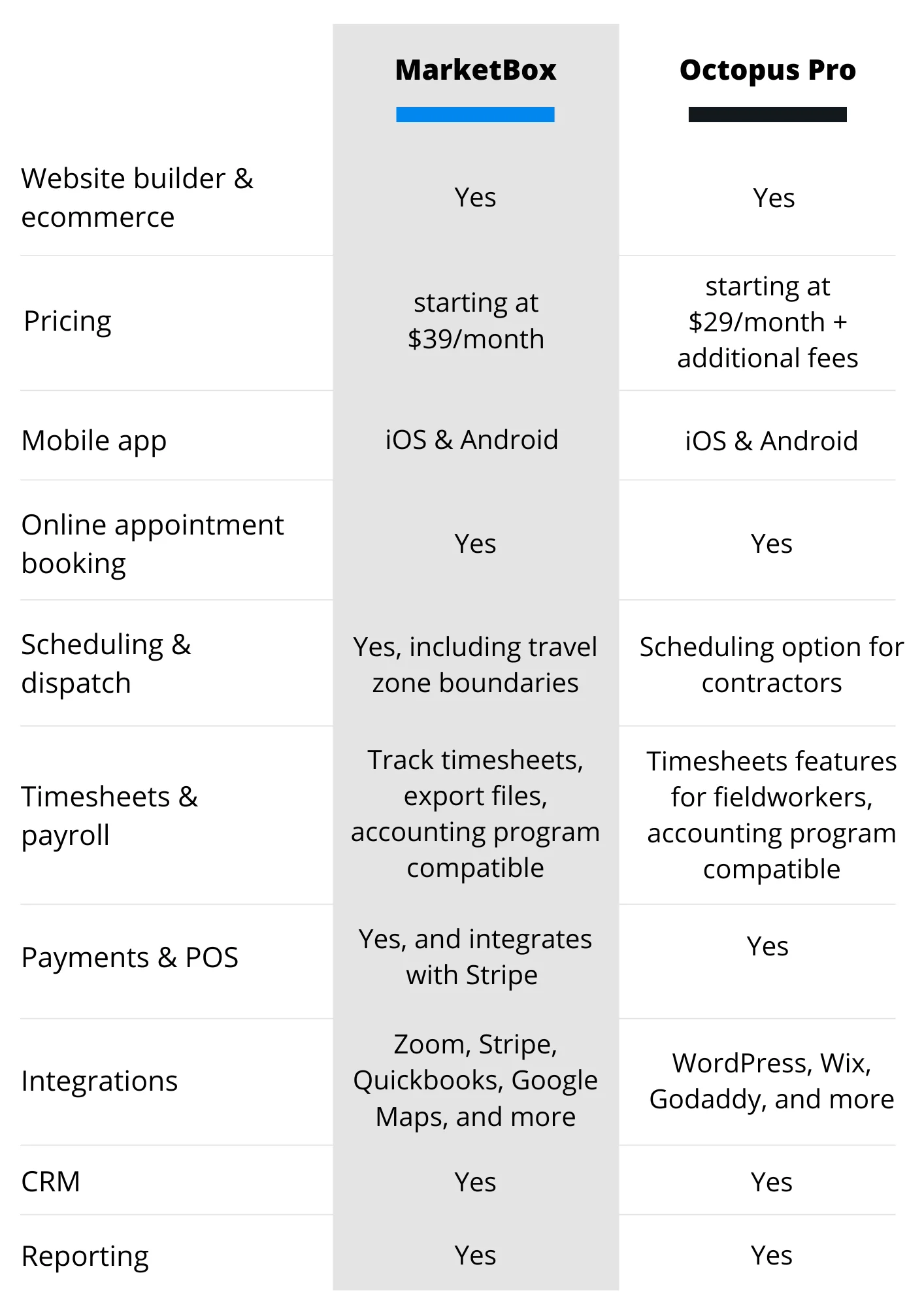 Discover how field service management software Octopus Pro measures up to industry-disruptor MarketBox's growth-focused business support and mobile-workforce-friendly features.