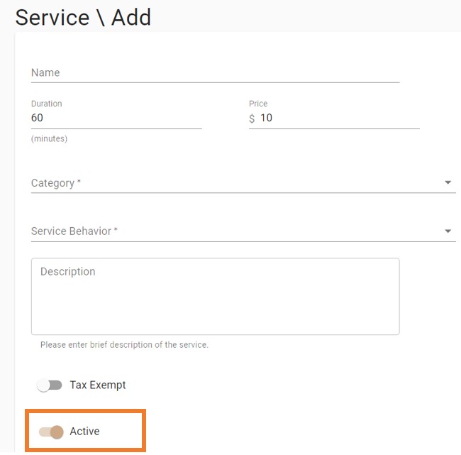 9. Active Switch: Use this switch if you want this service to be visible for clients to book. You can always turn this switch off if you would like to deactivate the service.