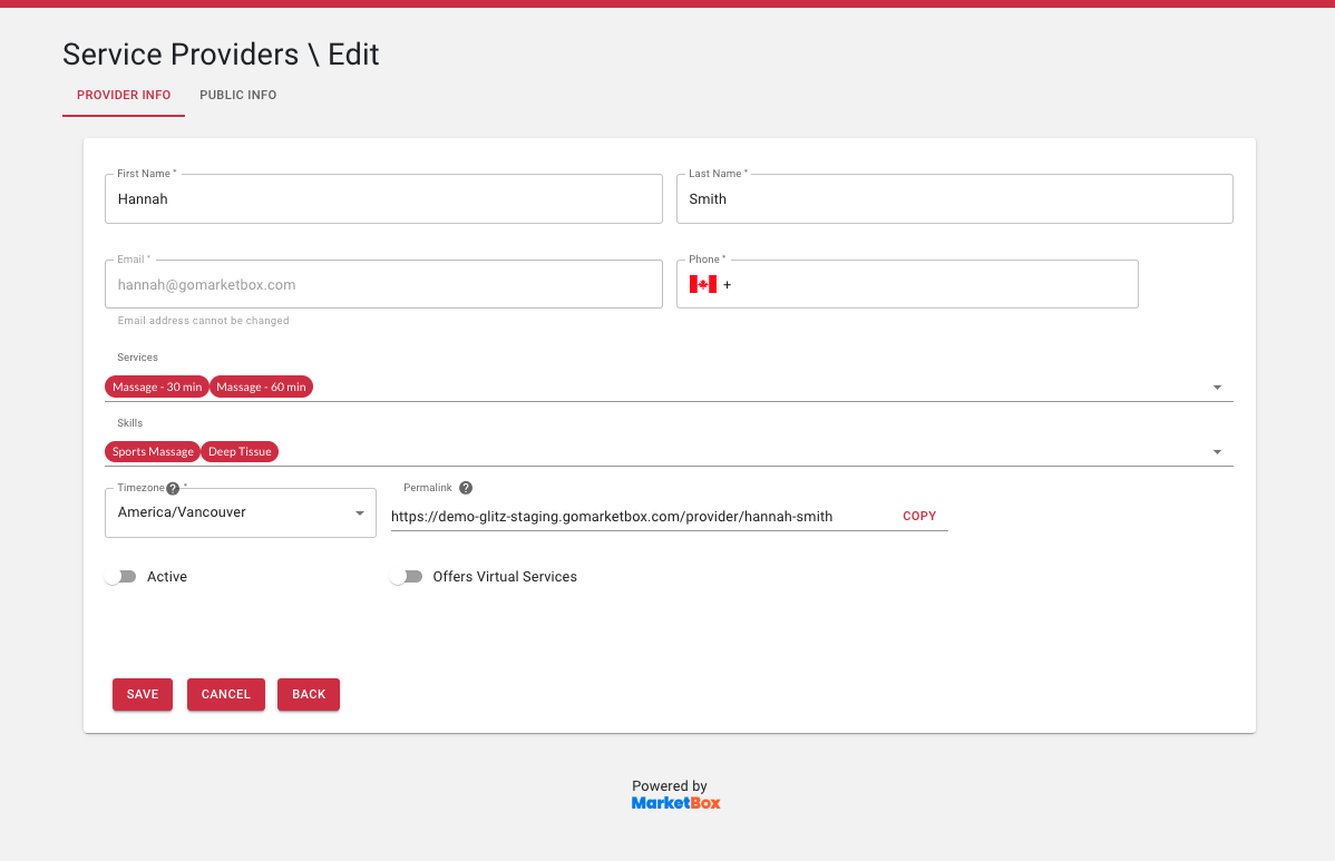 To prevent a provider from appearing in the booking flow without revoking their access to their MarketBox account, go to the Providers tab.