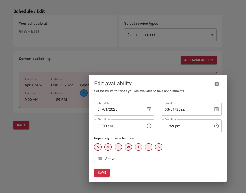 To set a provider’s schedule to inactive, select the relevant schedule from the providers’ tab, press the pencil icon to edit, set the status to inactive, and press Save.