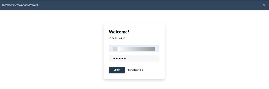 If you receive an “Incorrect username or password” error message when attempting to log in, check for any spelling errors in the email address or password.